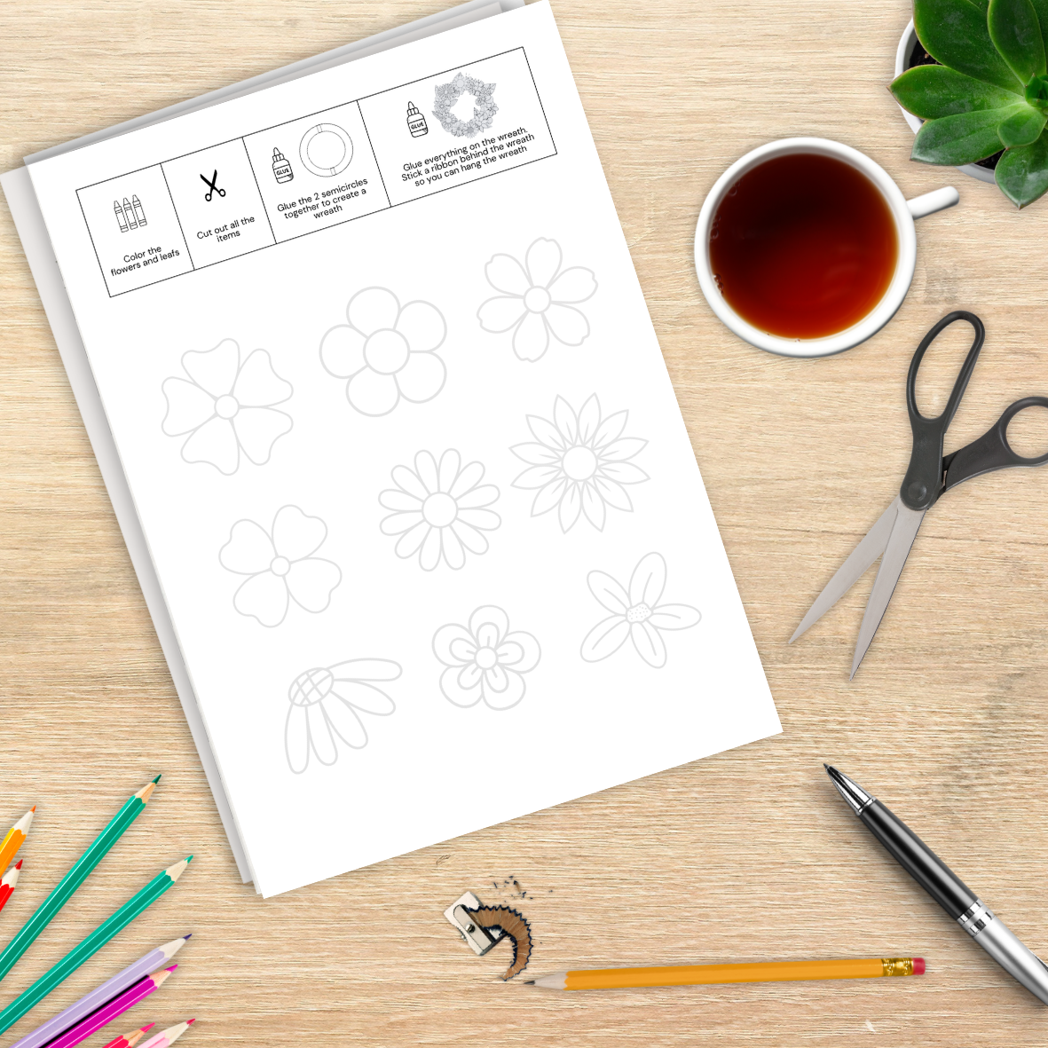 Papieren Bloemenkrans Printable – DIY Knutselpakket om te Kleuren & Knippen | Creatieve Decoratie voor Pasen & Lente (A4 PDF & PNG)