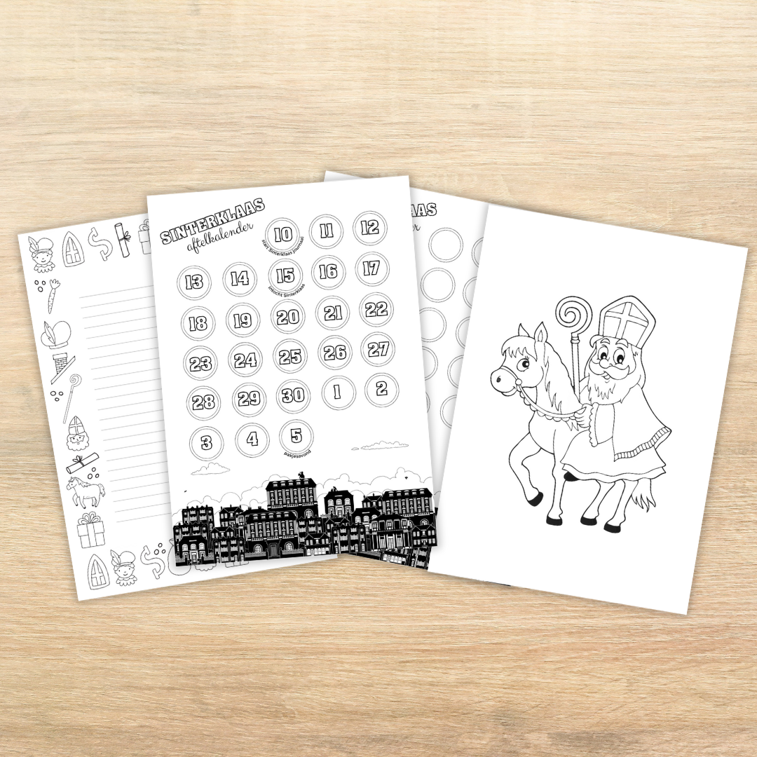 De printable set bestaat uit een kleurplaat, verlanglijstje en verschillende varianten aftelkalenders tot pakjesavond