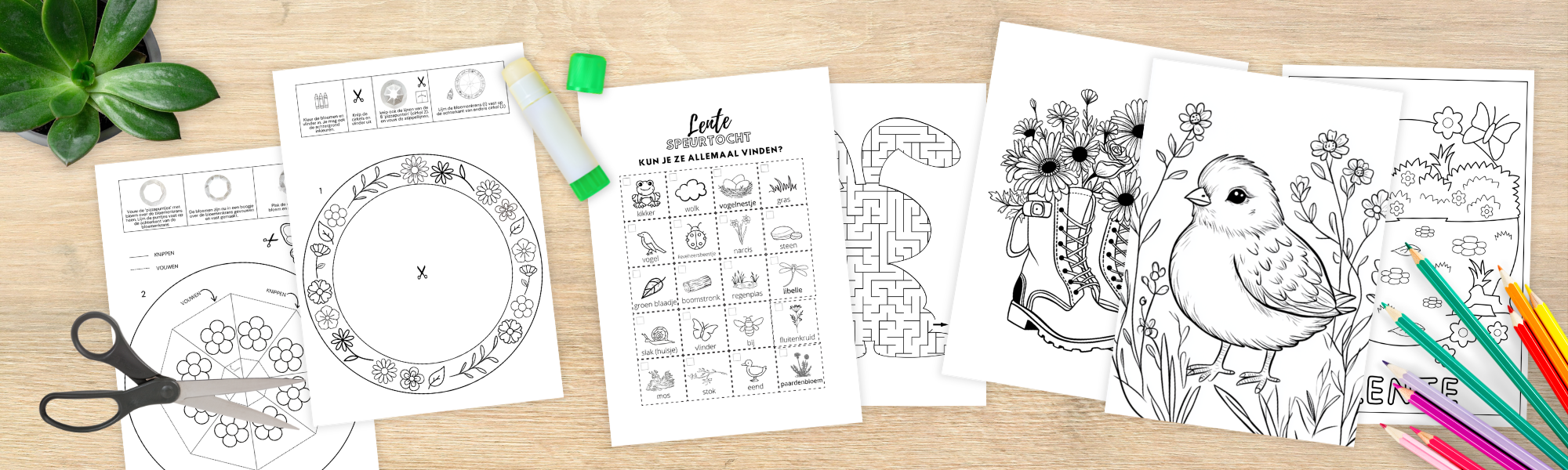 Met kleurplaten, een speurtocht, een doolhof en een eenvoudige 3D bloemenkrans zorg je zó voor een fijn moment aan tafel of gezellig buiten. Geen voorbereiding, geen stress, alleen even samen maken, kletsen en genieten.