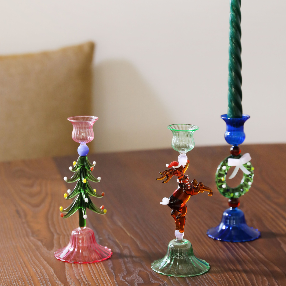 Handgeblazen kerst kandelaren met speels detail. Wat duurder, maar wel echte pareltjes elke kerst weer.