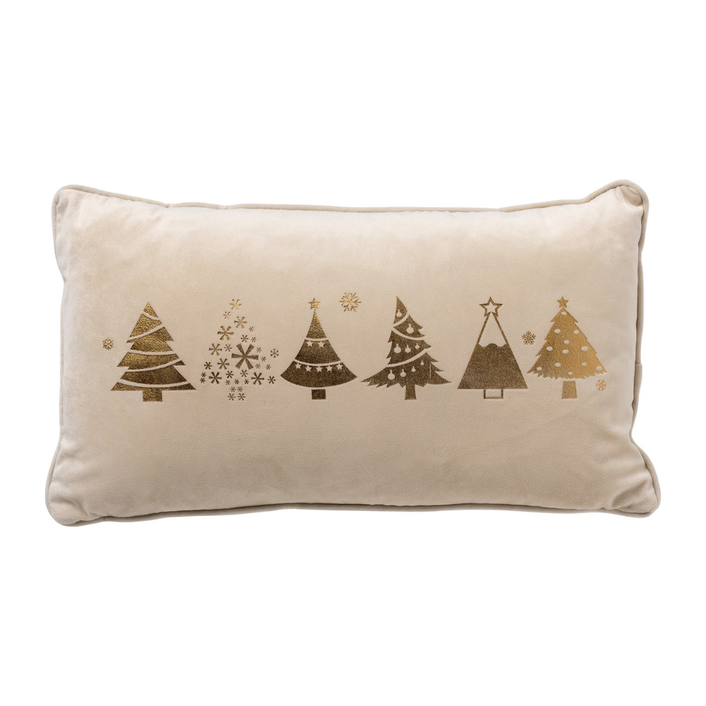 Dit stijlvolle kerstbomen kussen past perfect in een neutraal interieur.