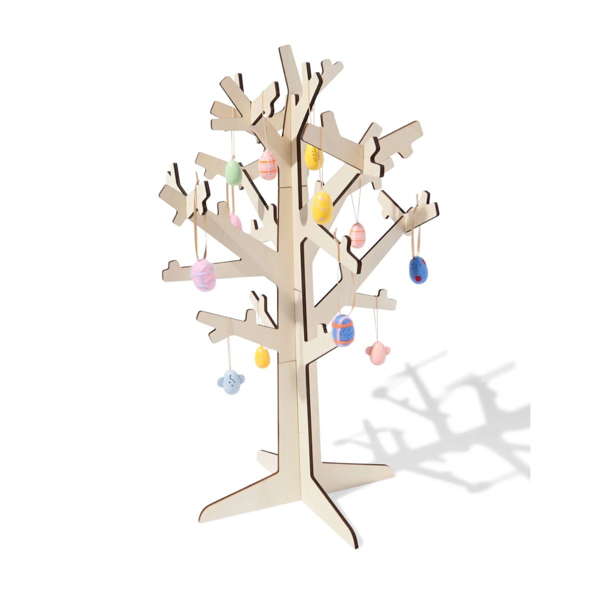 Deze houten paasboom zet je zo in elkaar en staat stevig op een kruisvoet. Leuk op tafel of vensterbank.