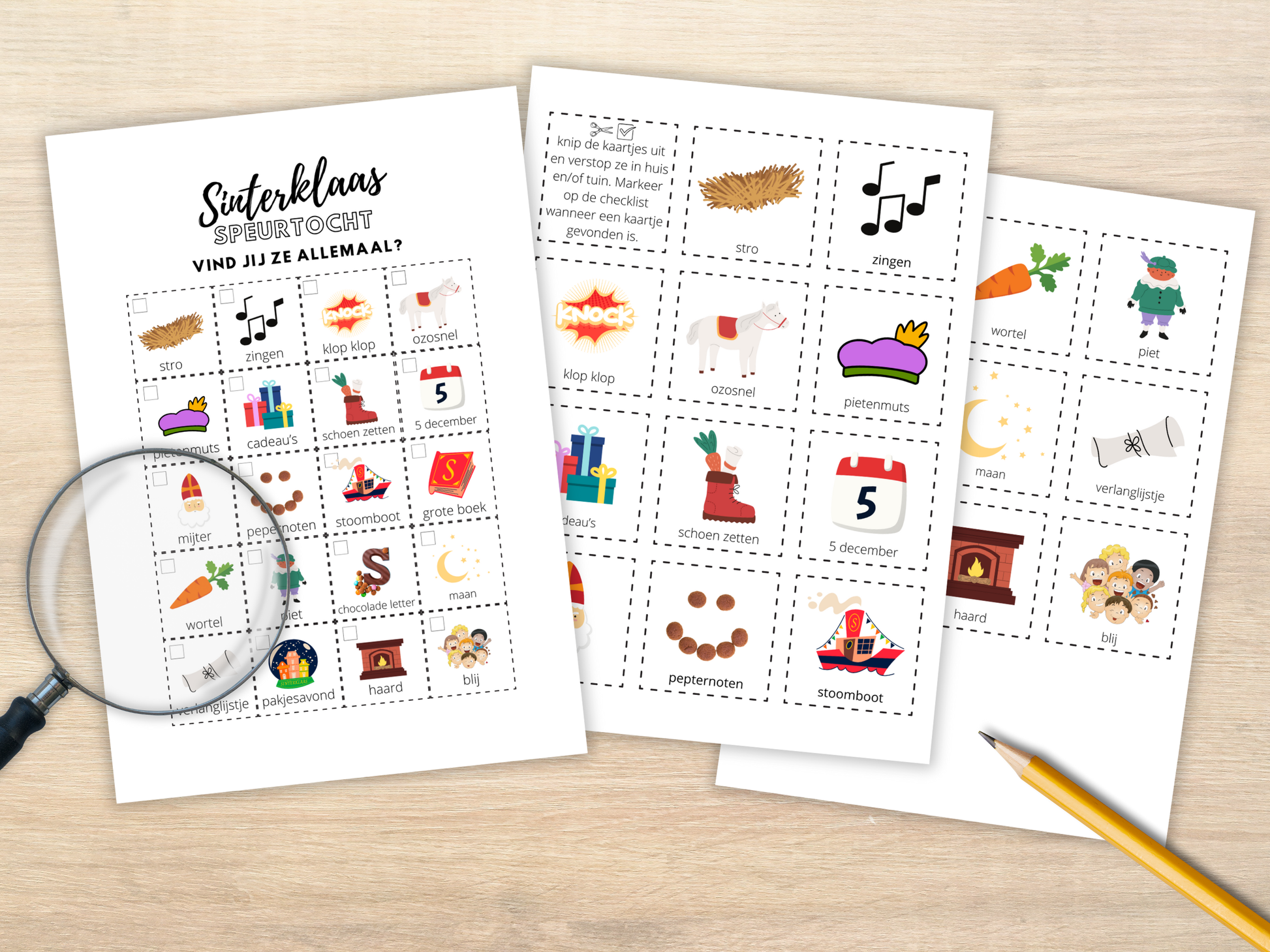 Kinderen gaan op zoek naar kaartjes met herkenbare Sinterklaaswoorden zoals mijter, chocoladeletter, stoomboot en piet. Perfect als activiteit tijdens pakjesavond, een Sinterklaasfeestje op school, of een gezellige middag thuis.